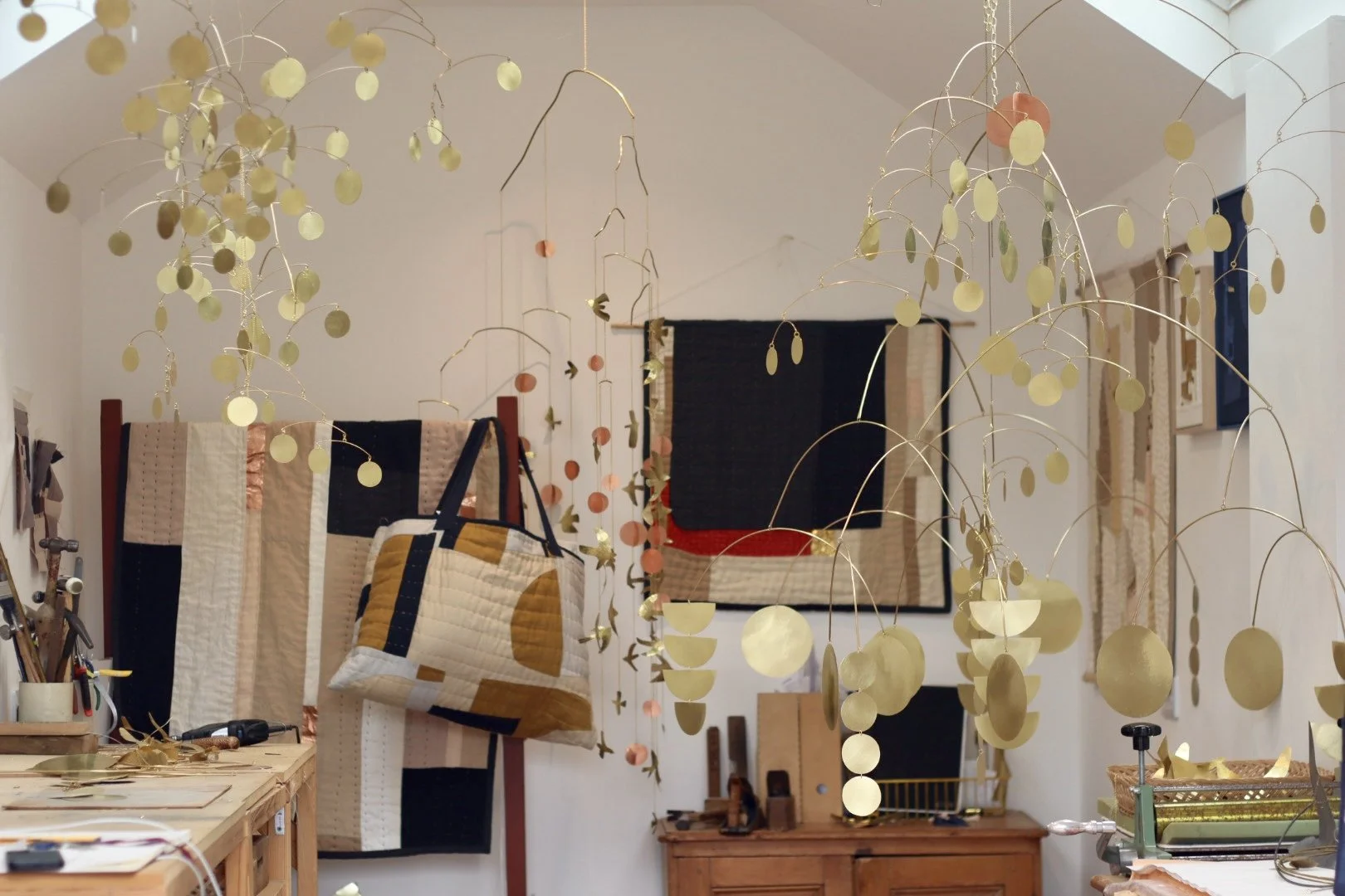 I work with metal and fabric to create kinetic mixed-metal mobiles and textile pieces that celebrate movement, light, and nature. Much of my work is made to commission for private residences, hotels, and boutiques, resulting in a variety of styles and scales.